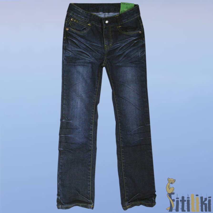 Описание: Джинсы для девочки с контрастной отстрочкой, легкими потертостями и модными замятостями по всей длине. Застегиваются на молнию и скобу (имитация пуговицы). Сзади два одинарных кармана, спереди - одинарный и двойной. Украшены заклепками на карманах. Объем талии регулируется внутренней утягивающей резинкой с двух сторон. Модель прямого кроя.